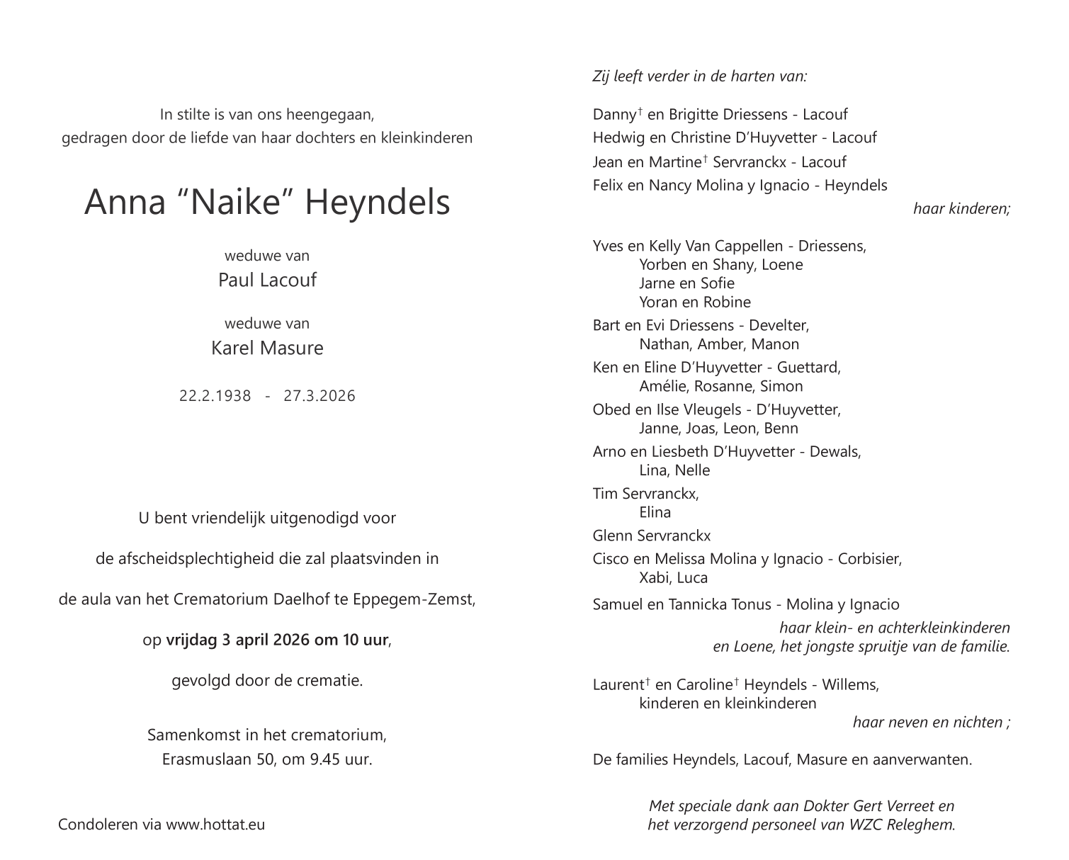 Overleden te Zemst (1980) op vrijdag 27 maart 2026 op 88-jarige leeftijd