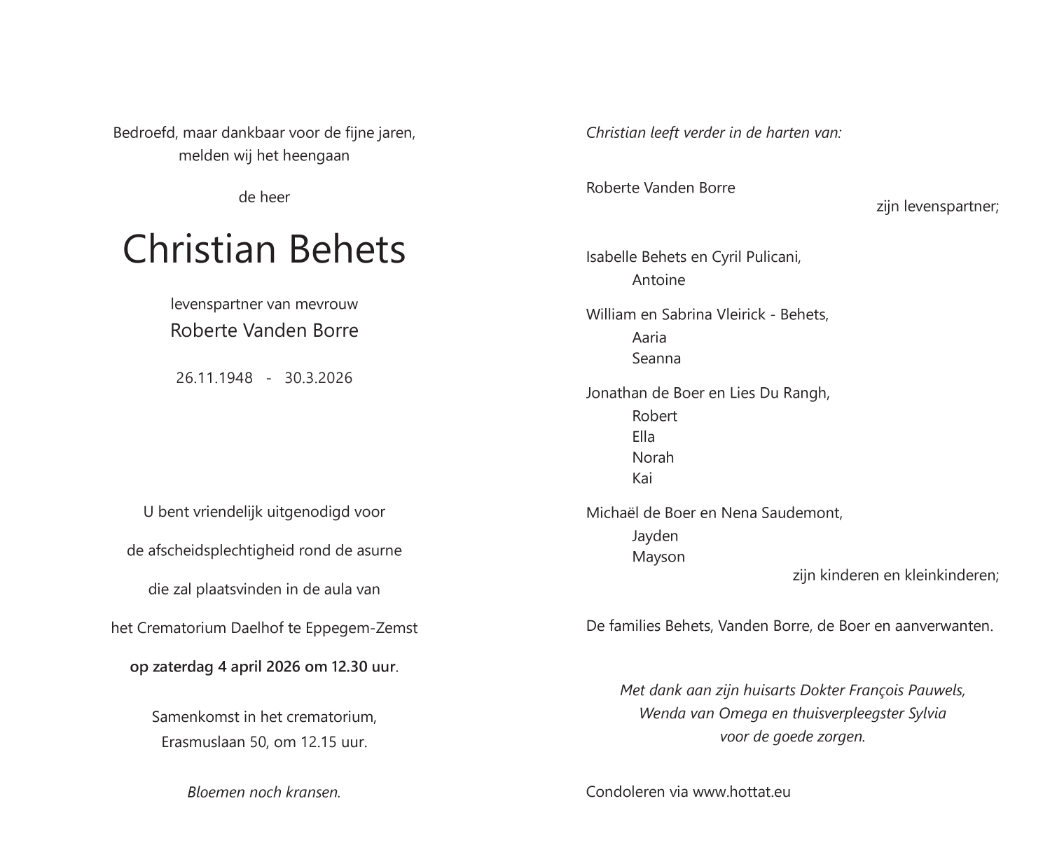 Overleden te Meise (1860) op maandag 30 maart 2026 op 77-jarige leeftijd