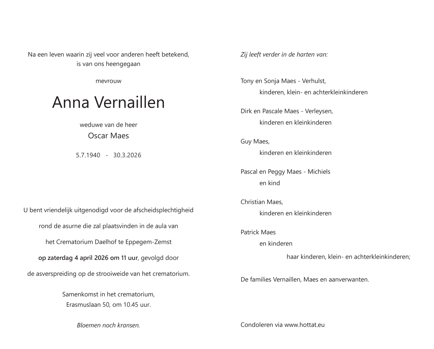Overleden te Vilvoorde (1800) op maandag 30 maart 2026 op 85-jarige leeftijd